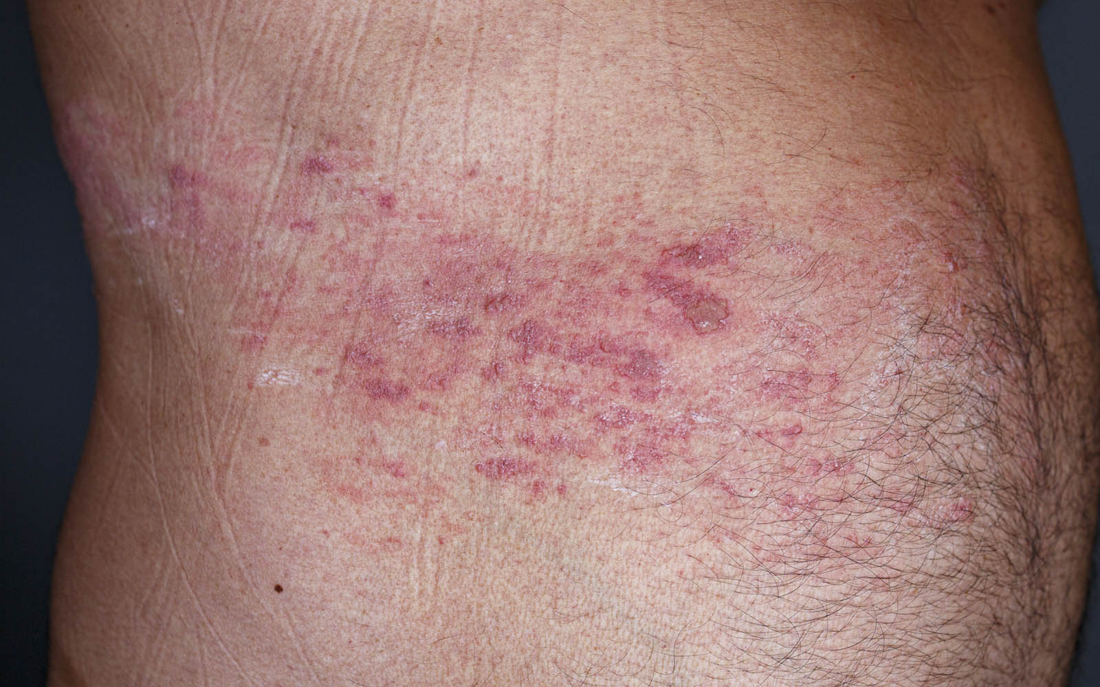 Karakteristisk for utslett ved helvetesild, er at det som regel kun forekommer på en side av kroppen og ligger som et belte langs hudområdet som er rammet.